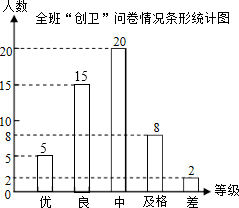 分析 (1)用中的频数÷频率就可以求出全班总人数.用总人数乘以良的百分比得到良的人数,再用总人数减去良、中、及格、差的人数就是优的人数,就可以补全条形统计图.再用优的人数÷总人数就可以求出得“优”的人数所占的百分比;