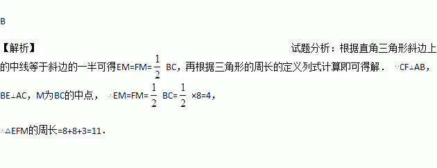 如图在△ABC中,CF⊥AB于F,BE⊥AC于E,M为BC的中点,EF=3,BC=8,则△EFM的周长是( )