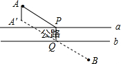 分析 将点A竖直向下平移到点A′,使AA′等于公路的宽度,连接A′B,与b交于点Q,过点Q作PQ⊥a于P,连接AP、BQ.则由A经过天桥走到B的最短路线的长:AP+PQ+QB=A′B+PQ.