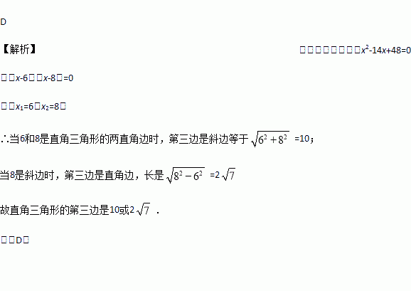 已知直角三角形的两条边长分别是方程x2-14x+48=0的两个根,则此三角形的第三边是( )