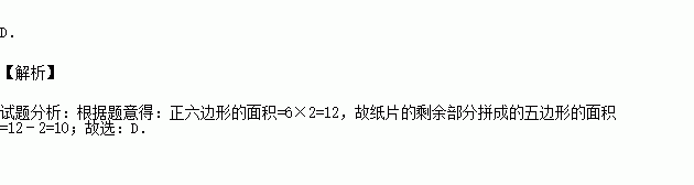 如图,在一张正六边形纸片中剪下两个全等的直角三角形(阴影部分),拼成一个四边形,若拼成的四边形的面积为2,则纸片的剩余部分拼成的五边形的面积为( )