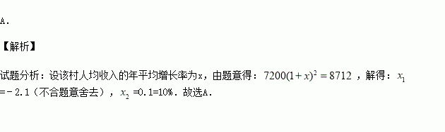 2011年向阳村农民人均收入为7200元,到2013年增长至8712元.这两年中,该村农民人均收入平均每年的增长率为( )