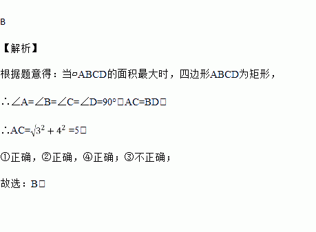 在?ABCD中,AB=3,BC=4,当?ABCD的面积最大时,下列结论:①AC=5;②∠A+∠C=180°;③AC⊥BD;④AC=BD.正确的有( )