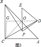 (3)根据等腰直角三角形的性质可计算出OC=$\frac{1}{2}$AB=2,OD=$\frac{1}{2}$EF=1,作CG⊥DO于G,如图3,设OG=x,CG=y,利用勾股定理得x2+y2=22,(1+x)2+y2=($\sqrt{7}$)2,解方程组得x=1,y=$\sqrt{3}$,接着利用三角函数定义可求出∠COG=60°,所以∠BOE=60°,然后根据旋转的性质得旋转角α的度数.