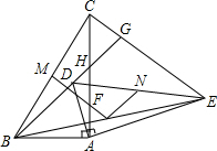 分析 根据相似三角形的性质得到∠AED=∠BCA=30°,根据三角函数的定义得到$\frac{AB}{AC}=\frac{AD}{AE}$=$\frac{\sqrt{3}}{3}$,于是推出△BDA∽△CEA;故①正确;由相似三角形的性质得到∠DBA=∠ACE,由三角形的内角和得到∠CGH=∠BAH=90°,于是得到BD⊥CE,故②正确;根据三角形的中位线即可得到∠MFN=90°,故③正确;由三角形的中位线的性质得到NF=$\frac{1}{2}$BD,MF=$\frac{1}{2}$CE,根据相似三角形的性质得到$\frac{BD}{CE}$=$\frac{AB}{AC}$=$\frac{\sqrt{3}}{3}$,等量代换得到$\frac{NF}{FM}$=$\frac{\sqrt{3}}{3}$,故④错误.