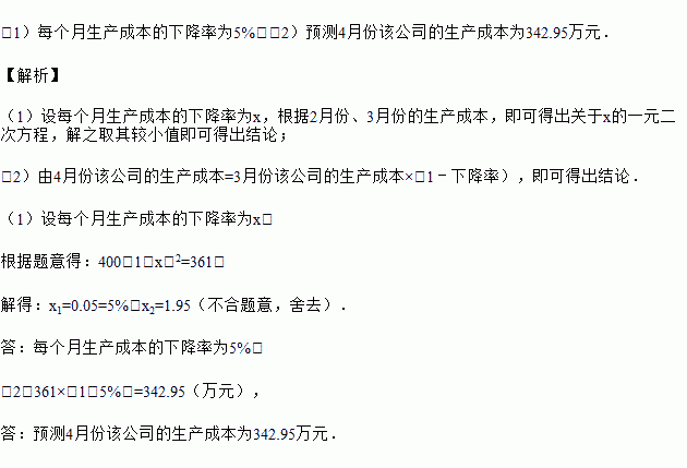 某公司今年1月份的生产成本是400万元,由于改进技术,生产成本逐月下降,3月份的生产成本是361万元.假设该公司2、3、4月每个月生产成本的下降率都相同.