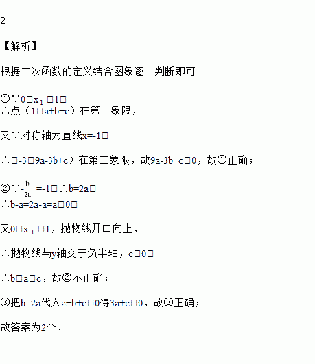 已知抛物线y=ax2+bx+c(a>0)的对称轴为直线x=-1,与x轴的一个交点为(x1,0),且0<x1<1,下列结论:①9a-3b+c>0;②b<c;③3a+c>0,其中正确结论两个数有______。