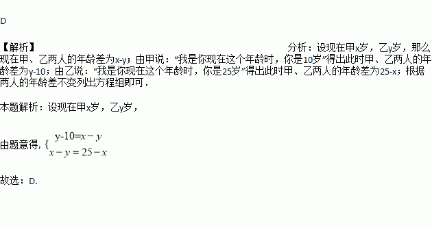 甲、乙两个人关于年龄有如下对话,甲说:“我是你现在这个年龄时,你是10岁”.乙说:“我是你现在这个年龄时,你是25岁”.设现在甲x岁,乙y岁,下列方程组正确的是( )