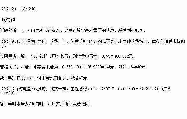 (1)若其中峰时电量控制为100度,则小明家下月所付电费能比普通电价收费时省多少元?