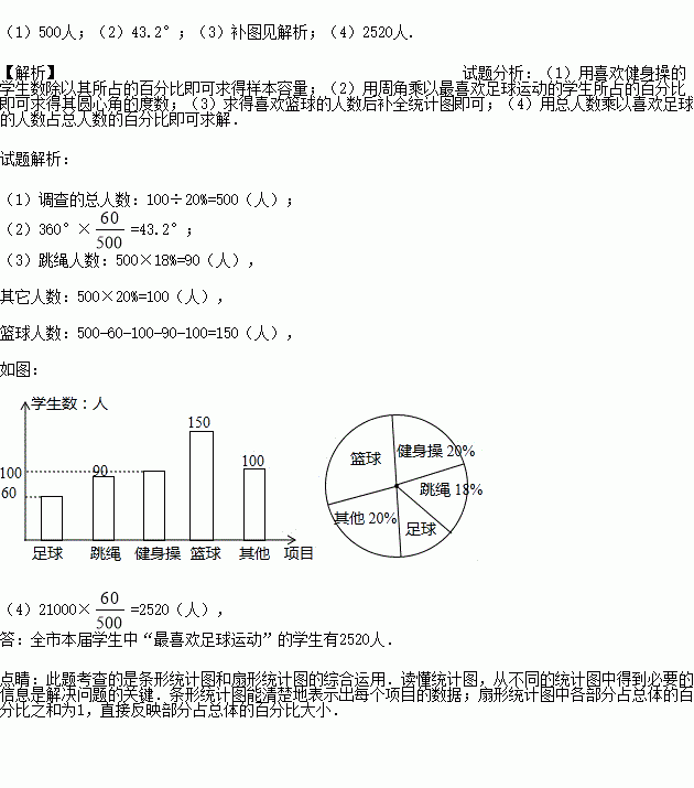 (4)若该市2015年约有初一新生21000人,请我估计全市本届学生中“最喜欢足球运动”的学生约有多少人?