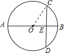 分析:连接OC,由AB的长求出半径OC的长,根据AB与CD垂直,利用垂径定理得到E为CD的中点,在直角三角形COE中,由OC与OE的长,利用勾股定理求出CE的长,即可确定出CD的长.