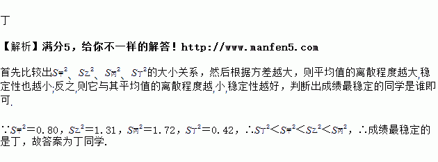 若甲、乙、丙、丁四个同学一学期4次数学测试的平均成绩恰好都是85分,方差分别为s甲2=0.80,s乙2=1.31,s丙2=1.72,s丁2=0.42,则成绩最稳定的同学是______.
