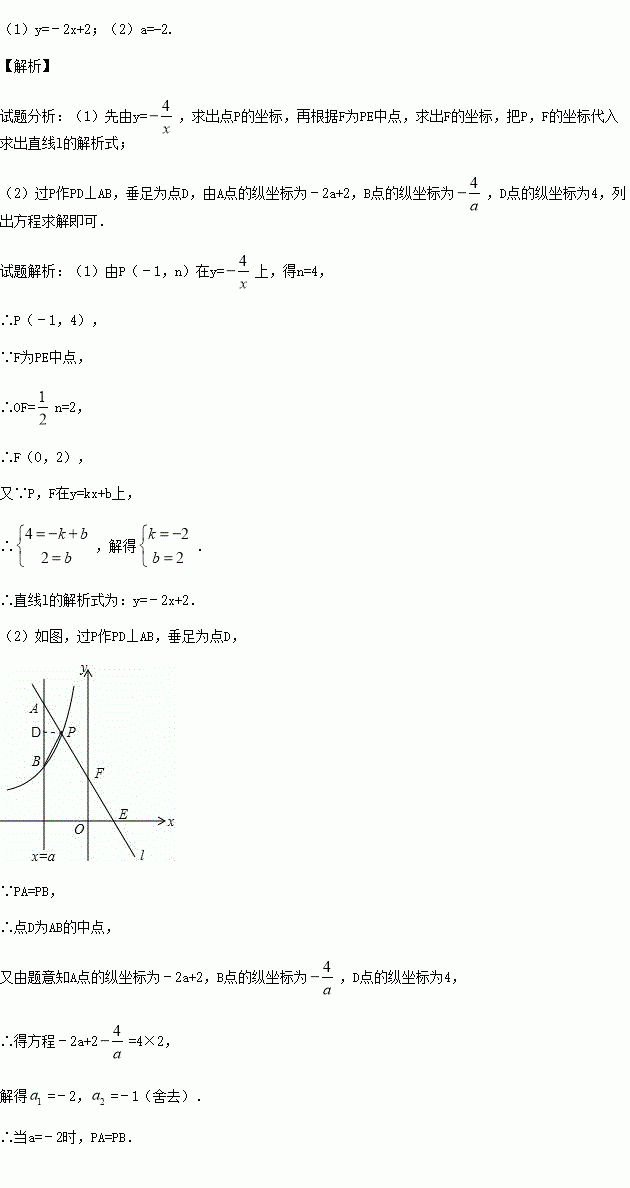 (2)若直线x=a与l交于点A,与双曲线交于点B(不同于A),问a为何值时,PA=PB?