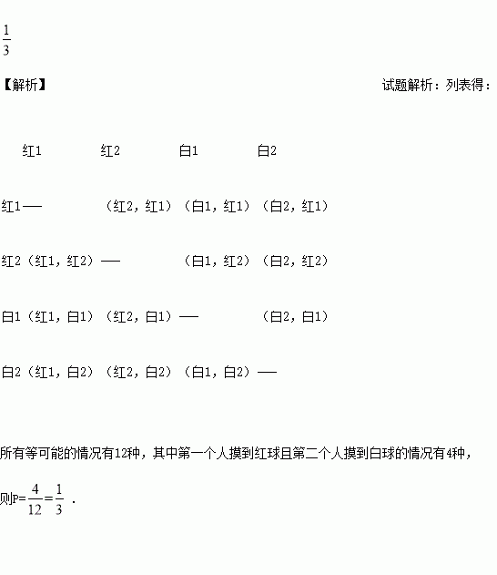 一个不透明的袋子中装有仅颜色不同的2个红球和2个白球,两个人依次从袋子中随机摸出一个小球不放回,则第一个人摸到红球且第二个人摸到白球的概率是 ______ .