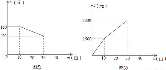 某农庄计划在30亩空地上全部种植蔬菜和水果,菜农小张和果农小李分别承包了种植蔬菜和水果的任务.小张种植每亩蔬菜的工资y(元)与种植面积m(亩)之间的函数如图①所示,小李种植水果所得报酬z(元)与种植面积n(亩)之间函数关系如图②所示.