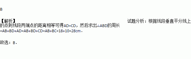 如图,DE是△ABC中边AC的垂直平分线,若BC=18cm,AB=10cm,则△ABD的周长为( ).