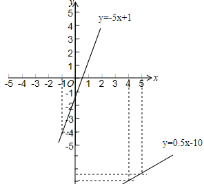 解答 解:在y=-5x+1中,当x=0时,y=1;当x=1时,y=-4.则函数经过点(0,1)和(-1,-4);在y=0.5x-10中,当x=4时,y=-8,当x=5时,y=-7.5,则函数经过点(4,-8)和(5,-7.5).