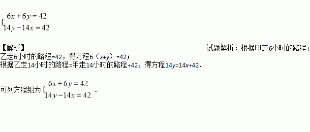 甲、乙两人相距42千米,若两人同时相向而行,可在6小时后相遇;而若两人同时同向而行,乙可在14小时后追上甲,设甲的速度为x千米/时,乙的速度为y千米/时,列出的二元一次方程组为__________.