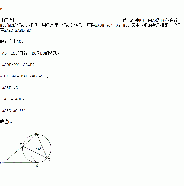 如图,AB为⊙O的直径,C为⊙O外一点,过点C作⊙O切线,切点为B,连结AC交⊙O于D,∠C=38°.点E在AB右侧的半圆上运动(不与A、B重合),则∠AED的大小是( )