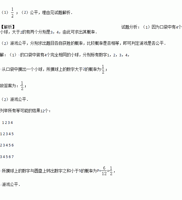 (2)小龙和小东想通过游戏来决定谁代表学校参加歌咏比赛,游戏规则为:一人从口袋中摸出一个小球,另一人转动圆盘,如果所摸球上的数字与圆盘上转出数字之和小于5,那么小龙去;否则小东去.你认为游戏公平吗?请用树状图或列表法说明理由.