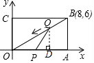 ∴$\frac{QD}{BA}$=$\frac{OQ}{OB}$=$\frac{OD}{OA}$,即$\frac{QD}{6}$=$\frac{10-t}{10}$=$\frac{OD}{8}$,
