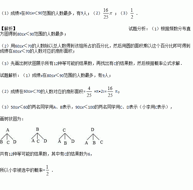 (2)若用半径为2的扇形图来描述,成绩在60≤x<70的人数对应的扇形面积是多少?