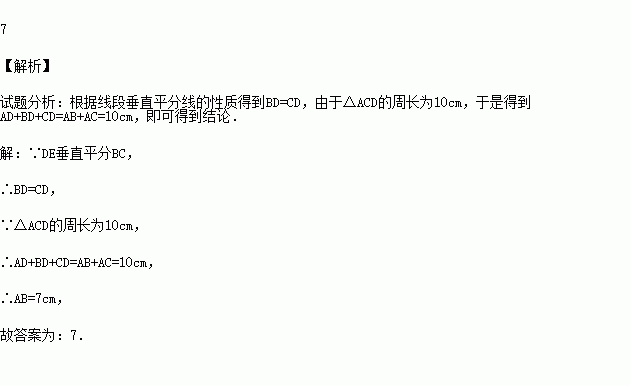(2015秋•镇江期末)如图,在△ABC中,BC的垂直平分线分别交AB、BC于D、E,若△ACD的周长为10cm,AC=3cm,则AB= cm.