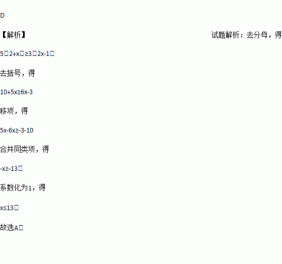 A. 5(2+x)≥3(2x﹣1) B. 10+5x≥6x﹣3 C. 5x﹣6x≥﹣3﹣10 D. x≥13