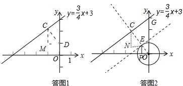③存在着点E、C,使点C与点E的“超级距离”取最小值.如答图2,只要将直线$y=\frac{3}{4}x+3$沿着y轴的负方向平移$\frac{7}{4}$单位长度时,此时直线与圆O在第二象限内相切,切点即为所求点E.再过点E作y轴的垂线EN,以E N为边画∠NER=45°,ER与直线HG交于点C,则点C为所求的点.