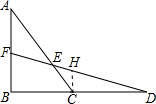 解答 解:(1)经测量AE=1.5cm,CE=0.75cm,AE:CE=2:1,(2)作CH∥AB交DF于H,∵CH∥AB,CD=BC,∴$\frac{CH}{BF}$=$\frac{1}{2}$,∵点F是AB的中点,∴$\frac{CH}{AF}$=$\frac{1}{2}$,∵CH∥AB,∴$\frac{AE}{CE}$=$\frac{AF}{CH}$=2.