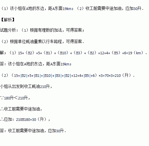 (2)若汽车每千米耗油3升,已知汽车出发时油箱里有180升汽油,问收工前是否需要中途加油?若加,应加多少升?若不加,还剩多少升汽油?