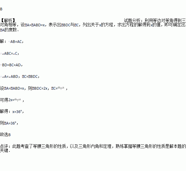 如图,在△ABC中,∠A=36°,AB=AC,BD是△ABC的角平分线,若在边AB上截取BE=BC,连接DE,则图中等腰三角形共有( )