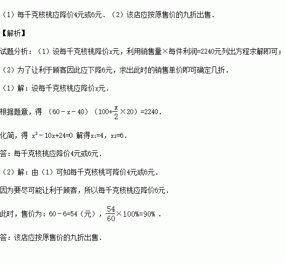 (2012•山西)山西特产专卖店销售核桃,其进价为每千克40元,按每千克60元出售,平均每天可售出100千克,后来经过市场调查发现,单价每降低2元,则平均每天的销售可增加20千克,若该专卖店销售这种核桃要想平均每天获利2240元,请回答: