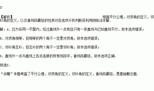 D. 直线外一点与直线上各点连接的所有线段中,垂线段最短