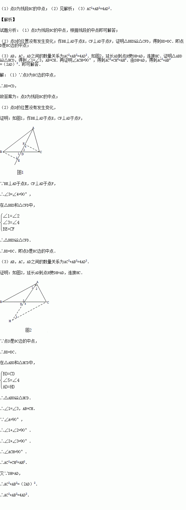 (3)如图3,当△ABC是直角三角形,∠A=90°,并且点D满足(2)的位置条件,用等式表示线段AB,AC,AD之间的数量关系并加以证明.