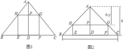 分析 (1)由正方形的性质可得:HG∥BC,进而可得:△AHG∽△ABC,然后由相似三角形的对应高的比等于相似比,得到:$\frac{AP}{AD}=\frac{HG}{BC}$,即$\frac{h-x}{h}=\frac{x}{a}$,从而可求正方形EFGH的边长x的值;
