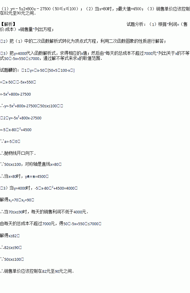 某企业设计了一款工艺品,每件的成本是50元,为了合理定价,投放市场进行试销.据市场调查,销售单价是100元时,每天的销售量是50件,而销售单价每降低1元,每天就可多售出5件,但要求销售单价不得低于成本.