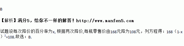 某药品经过两次降价,每瓶零售价由168元降为108元,已知两次降价的百分率相同,设每次降价的百分率为x,根据题意列方程得( )