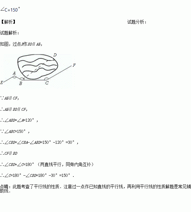 如图,一条公路修到湖边时,需拐弯绕湖而过,如果第一次拐的角∠A是120°,第二次拐的∠B是150°,第三次拐的角是∠C,这时的道路恰好和第一次拐弯前的道路平行,求∠C的度数。