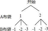 有A,B两个黑布袋,A布袋中有两个完全相同的小球,分别标有数字1和2.B 布袋中有三个完全相同的小球,分别标有数字-1,-2和-3.小明从A布袋中随机取出一个小球,记录其标有的数字为x,再从B布袋中随机取出一个小球,记录其标有的数字为y,这样就确定点Q的一个坐标为(x,y).