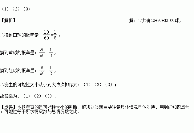 一只不透明的袋子中装有10个白球、20个黄球和30个红球,每个球除颜色外都相同,将球搅匀,从中任意摸出一个球,则下列事件:(1)该球是白球;(2)该球是黄球;(3)该球是红球,按发生的可能性大小从小到大依次排序为: (只填写序号)