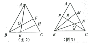 (2)如图2,△ABC中,E、F分别是BC、AC边上一点,且有BE:EC=1:2,AF: FC=1:1,AE与BF相交于点G、现作EH ∥BF交AC于点H、依次求FH :HC、AG: GE、BG:GF的值