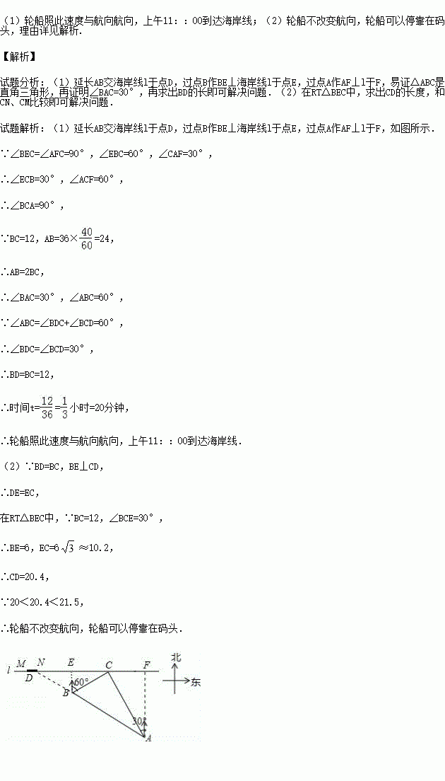 如图,在一条笔直的东西向海岸线l上有一长为1.5km的码头MN和灯塔C,灯塔C距码头的东端N有20km.以轮船以36km/h的速度航行,上午10:00在A处测得灯塔C位于轮船的北偏西30°方向,上午10:40在B处测得灯塔C位于轮船的北偏东60°方向,且与灯塔C相距12km.