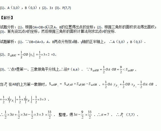 (1)、求点A、B的坐标;(2)、已知点C(-2,2),求△BOC的面积; (3)、点P是第一象限角平分线上一点,若