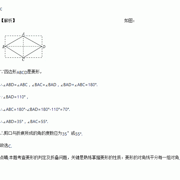 如图,把一个矩形的纸片按图示对折两次,然后剪下一部分,为了得到一个钝角为110°的菱形,剪口与第二次折痕所成角的度数应为 ( )