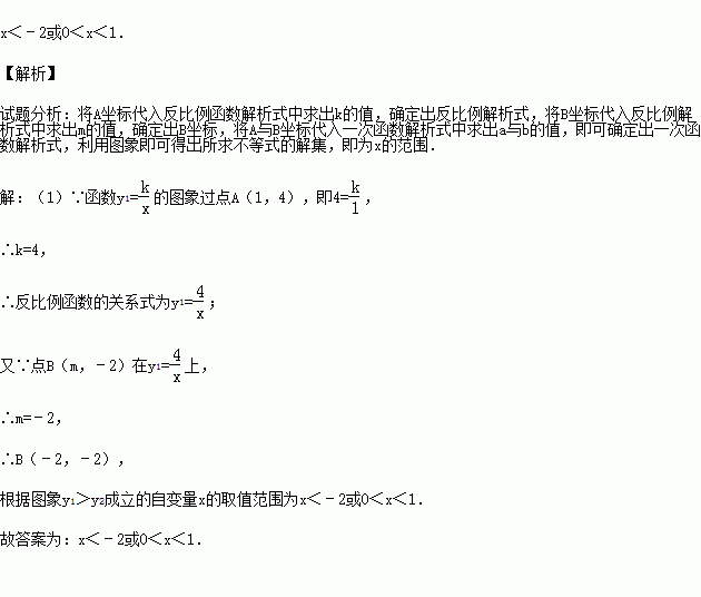 的图象与一次函数y2=ax+b的图象交于点A(1,4)和点(m,﹣2),则满足y1>y2的自变量x的取值范围是 .