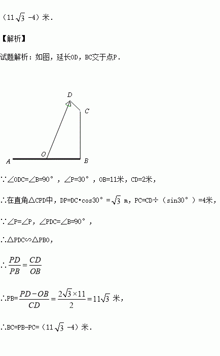如图,要在宽为22米的滨湖大道AB两边安装路灯,路灯的灯臂CD长为2米,且与灯柱BC成120°角,路灯采用圆锥形灯罩,灯罩的中轴线DO与灯臂CD垂直,当灯罩的轴线DO通过公路路面的中心线时照明效果最佳。此时,路灯的灯柱BC高度应该设计为 .