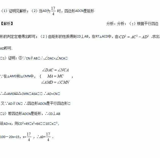已知:如图,D是△ABC的边上一点,M是AC的中点,CN∥AB交DM的延长线于N,且AB=10,BC=8,AC=7.