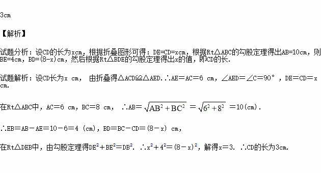 如图,有一块直角三角形纸片,两直角边AC=6 cm,BC=8 cm,现将直角边AC沿直线AD折叠,使它落在斜边AB上,且与AE重合,求CD的长.