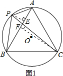 分析 (1)利用圆周角定理可得∠BAC=∠CPB,∠ABC=∠APC,而∠APC=∠CPB=60°,所以∠BAC=∠ABC=60°,从而可判断△ABC的形状;